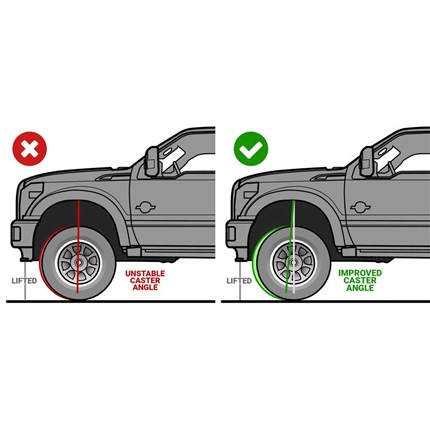 Caster, the steering pivot angle, is tilted either forward (negative) or rearward (positive) from vertical. Installing a suspension lift or leveling kit will cause a reduction in steering caster angle. This can result in wandering, wobble, and general steering instability. Larger tires can exaggerate the problem and require more positive caster. By installing BD's Cam Caster Adjusting kit on the radius control arms of the Ford Super Duty's, you can correct the problem by increasing the caster angle to gain stability.