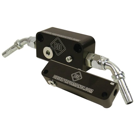 When producing more power from a Dodge RAM 2500/3500 with a Cummins engine, more fuel is required. To supply the injection pump with additional fuel, upgraded lift pumps are added, often with additional filters and water separators to ensure the fuel is always clean. With these upgrades, the factory fuel filter assembly becomes a redundant restriction, or is bypassed completely. The BD Diesel Fuel Bowl Delete kit is designed to remove the factory fuel filter assembly, and allow the addition of a fuel pressure sensor. The kit can also be used as a distribution block for applications using dual CP3 kits. Please note that this kit is intended to be an accessory in addition to an auxiliary lift pump and filter assembly. If the factory CP3 pump feed line has not been upgraded to 1/2-inch hose, an upgraded feed line assembly will be required. See optional accessories for details. WARNING: The use of this kit without auxiliary filters and water separators installed is strongly discouraged. Without a fuel filter in place, the injection system on the diesel engine could become damaged.