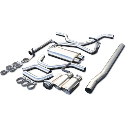 These easy-to-install 304 stainless steel exhaust kits use the factory hangers and clear your factory-mounted spare tire. A single 3” inlet pipe splits into two, 2.5” over-axle tailpipes after the 304 stainless steel muffler containing reinforced internal baffles. The exhaust then exits the two large-diameter stainless steel tips.