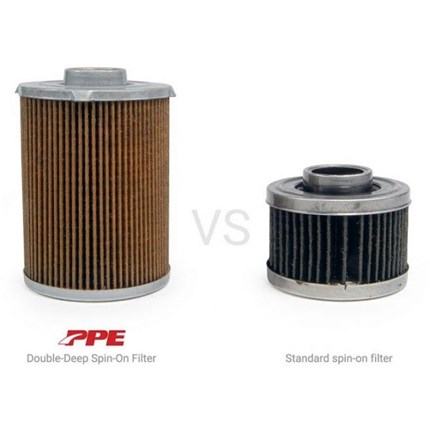 Inside the PPE Double-Deep Spin-On Filter is 2.72 times more filter media surface area. This increased surface area allows improved fluid flow and filtering. The PPE Double-Deep Filter actually traps particles down to 15 microns, that is half the size of what the standard spin-on filter catches. These improvements help create a cleaner flow of oil to vital internal components, resulting in smooth, more responsive shifts.