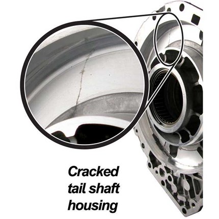 Cracked transmission tail shaft housings (located between the transfer case and the transmission) are a common problem for GM Allison-equipped 4x4 pick-ups in off-road and drag racing applications. Even a nominal amount of driveline vibration can cause the housing to fail, resulting in a transmission fluid leak or worse; internal transmission and transfer case damage. Once the housing cracks, repairing it requires removal of the transmission and transfer case.