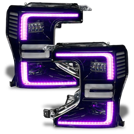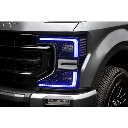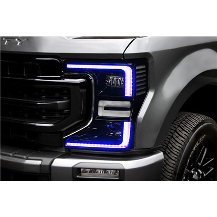 Customize your headlights to the max with dynamic styling! The ORACLE Lighting Dynamic ColorSHIFT Headlight DRL Upgrade Kit for the 2020-2022 Ford F-250/350 Super Duty features our Dynamic ColorSHIFT technology for brilliant chasing colors and our dynamic turn signals -- all with the best quality LED components. The latest advancement in our expansive lighting modifications, our Dynamic ColorSHIFT technology allows the user to run multi-color moving patterns. Conveniently controlled through a free smartphone app, the system features over 200 pre-programmed moving patterns as well as static color control and white mode for normal street driving. In addition to the pre-programmed features, the user can also create custom designs through pixel editing in the app. These vividly eye-catching lighting effects are sure to wow any car enthusiast, and the chasing RGB DRLs are made stress-free by our plug-and-play wiring. Connect the ring terminals to the + and - battery terminals, then control your lights with the smartphone app from the included Dynamic ColorSHIFT controller. The integrated LED Driver features both DRL and turn indicator inputs. The switchback LED indicator features our exclusive dynamic FLOW turn signal effect. Using the latest lighting technology, our cutting-edge DRL kit for the Super Duty is a great way to personalize your ride with show-stopping looks and industry-leading performance. Stand out from the look-alikes with an ORACLE Lighting DRL kit!