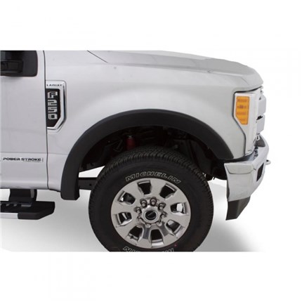 Give your 2017-2020 Ford F-250/350 Super Duty the appearance of an upmarket trim level with the Bushwacker 20944-02 OE Style Fender Flare Set. Bushwacker Fender Flares install easily with no drilling. And, they're designed specifically to complement your vehicle's styling, so it looks like it came from the factory that way, with a fit, finish, and level of protection that exceeds original equipment. You can leave your "OE" Style Fender Flares with their original matte black finish for a sporty, blackout look. Or, paint them to match or accent the body color for the look of limited-edition luxury or something completely customized.