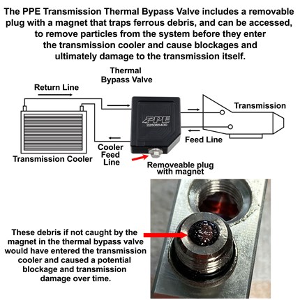 Add another measure of protection and increase fluid flow with the easy-to-install billet aluminum PPE Transmission Fluid Thermal Bypass Valve for your Dodge/RAM/Jeep. The OEM part has restrictive internal passages. When the OEM valve fails in the closed position, transmission fluid doesn’t reach your cooler. This can be caused by mechanical failure or debris. The result of stock valve failure can cause the transmission to dangerously overheat. Without properly cooled transmission fluid, the demands of towing and rigorous stop-and-go driving conditions shorten the life of transmission components. The PPE Bypass Valve eliminates the mechanical valve which maximizes fluid flow from the transmission cooler.