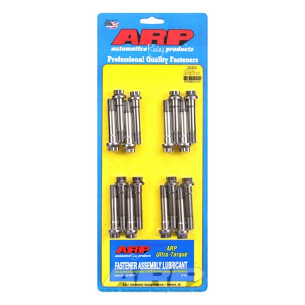 Material: ARP2000Pro Series Wave Loc BoltsFor the most severe applications, in conjunction with aftermarket I-beam rods, ARP has developed the "Pro" Series Wave-Loc bolts. These ultra heavy-Duty rod bolts are made from a special material designated ARP2000. It has approximately 200% the fatigue life of 8740 chrome moly steel and has a tensile strength of about 220,000 psi, and is capable of more than 12,000 lbs. clamping force.TECH NOTE: ROD BOLTSUnquestionably the most important fasteners in any engine are the connecting rod bolts, as they hold the key to the entire rotating assembly. A broken bolt will lead to a catastrophic engine failure. As you can imagine, the most critical joint is where the connecting rod halves mate. The rod bolts must support the primary tension loads caused by each rotation (or cycle) of the crankshaft. When the crank rotates, the big end of the connecting rod essentially becomes oval-shaped and the rod bolts bend. As the crankshaft continues to rotate, the rod becomes round again. With alternating tension loads and cyclic bending of the bolts, it is very important to install fasteners that are able to exert a clamping force greater than the load imposed upon the join (tension).In addition to utilizing a rod bolt with sufficient strength to withstand the tremendous cyclical strains placed upon it, it is absolutely imperative that the bolts be properly tightened. The preferred method of monitoring the correct amount of tension is through use of a stretch gauge. This is far more accurate than using a torque wrench. Moreover, through subsequently checking the rod bolts length at teardowns, it is possible to determine if it has been stressed beyond safe limits and must be replaced.