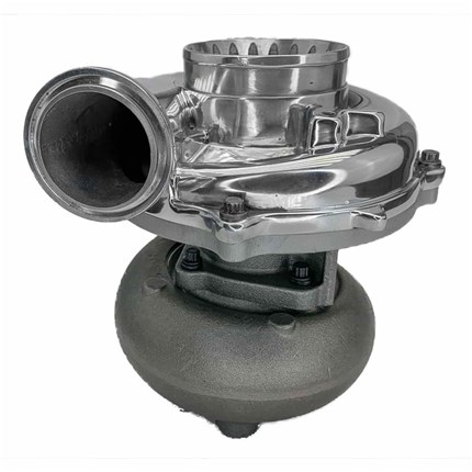 This is a journal bearing turbo with a Borg Warner 300sxe Style turbine wheel, modified to fit inside a drop in ready Super Duty turbo.