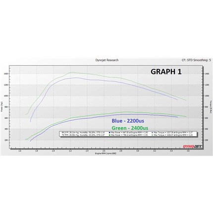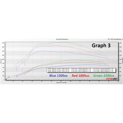100% nozzles: GRAPH 3 1300us: 742hp 1411tq BLUE LINES 1800us: 857hp 1675tq RED LINES 2200us: 946hp 1787tq GREEN LINES
