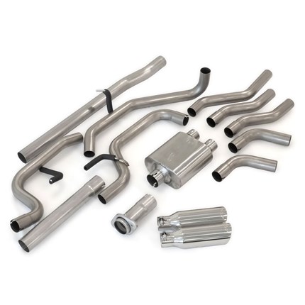 These easy-to-install 304 stainless steel exhaust kits use the factory hangers and clear your factory-mounted spare tire. A single 3” inlet pipe splits into two, 2.5” over-axle tailpipes after the 304 stainless steel muffler containing reinforced internal baffles. The exhaust then exits the two large-diameter stainless steel tips.