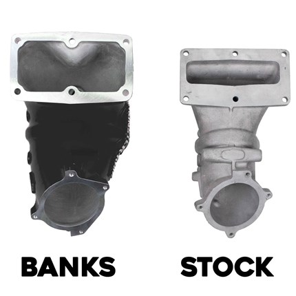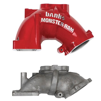 Utilizing the latest in CFD (computational fluid-dynamics), tested on the flow bench, the dyno, and on-road, Monster-Ram is a beast that only Banks could have unleashed. A direct-replacement aluminum casting, Monster-Ram is instant power, performance, and acceleration gratification. The factory inlet elbow is cramped and angular in order to accommodate the path of the stock No. 1 fuel line. Banks Engineers designed a new No. 1 fuel line, allowing the Monster-Ram to flow more air without obstruction.