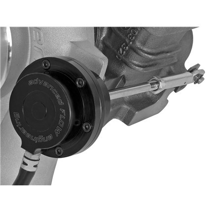 Compressor: The compressor features a light-weight billet aluminum compressor wheel with a 56mm inducer and 81mm exducer to improve turbo spool-up, handle high wheel speeds, and boost pressures. Also included is a CNC-machined, black anodized billet adjustable aluminum wastegate actuator.