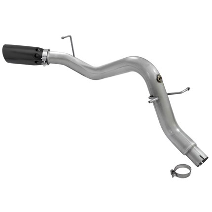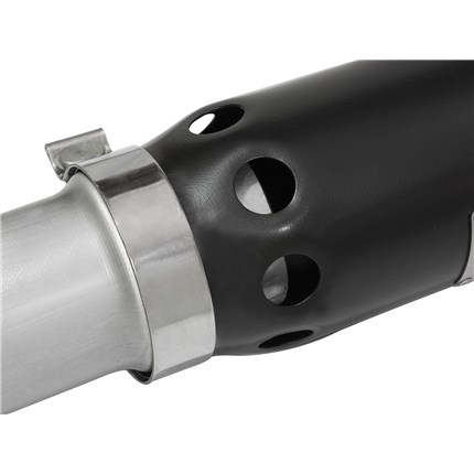 5" Diameter Black Intercooled Tip: Finishing off the exhaust is a 5" diameter, black, stainless steel slash cut tip with intercooling vents designed to reduce exhaust gas temperatures at the tailpipe. A unique stainless steel laser-cut aFe Power logo plate is riveted on for an aggressive style.