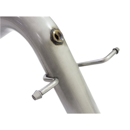 5" Diameter Polished Intercooled Tip: Finishing off the exhaust is a 5" diameter, high luster polished, stainless steel slash cut tip with intercooling vents designed to reduce exhaust gas temperatures at the tailpipe. A unique stainless steel laser-cut aFe Power logo plate is riveted on for an aggressive style.