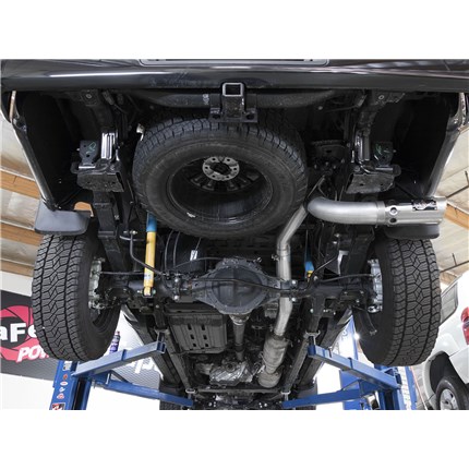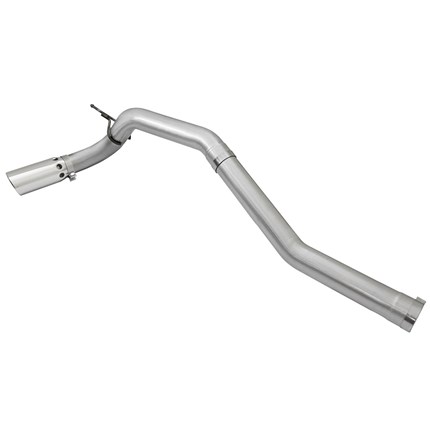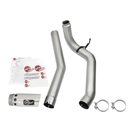 5" Diameter Polished Intercooled Tip: Finishing off the exhaust is a 5" diameter, polished, stainless steel slash cut tip with intercooling vents designed to reduce exhaust gas temperatures at the tailpipe. A unique stainless steel laser-cut aFe Power logo plate is riveted on for an aggressive style.