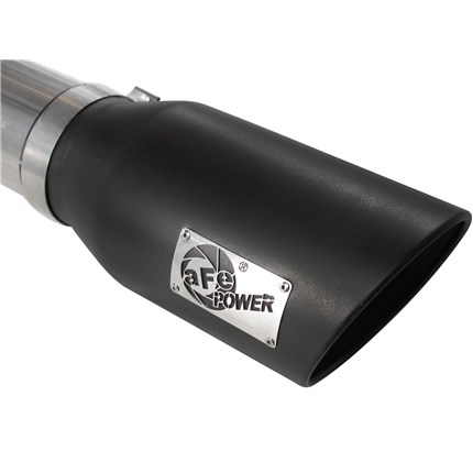 Massive 7" Black Tip: Finishing off the exhaust is a powder-coated black 304 stainless steel exhaust tip. This tip features a drain port on the bottom to keep rust and corrosion away. A unique stainless steel laser-cut aFe Power logo plate is riveted on for an aggressive style.