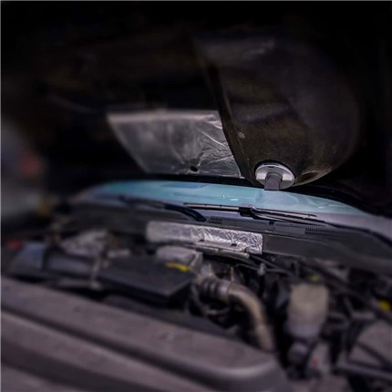 Installing the aluminum L5P hood drain ring is as painless as you can imagine. All you need to do is locate the factory drain near the bottom of the underside of your hood. Once you find that, twist it off and twist the new one on. Remove the gasket from the factory drain by pressing the drain nipple back towards the lock ring. With the gasket in hand, you're able to complete the installation process by twisting the new drain cover on and connecting and tightening the gasket.