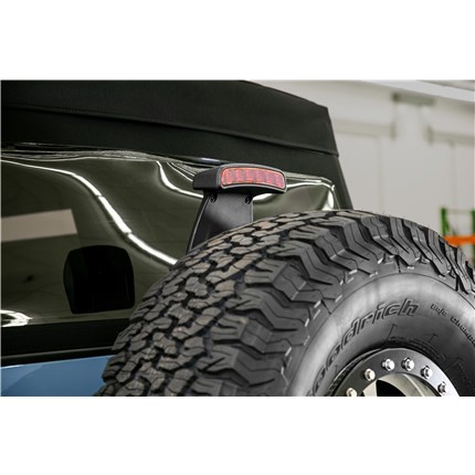 Simple bolt-on 3rd brake light relocation bracket to make room for those larger tires (up to 37"). This relocation kit positions the 3rd brake light about 2.4 inches higher than the stock location.