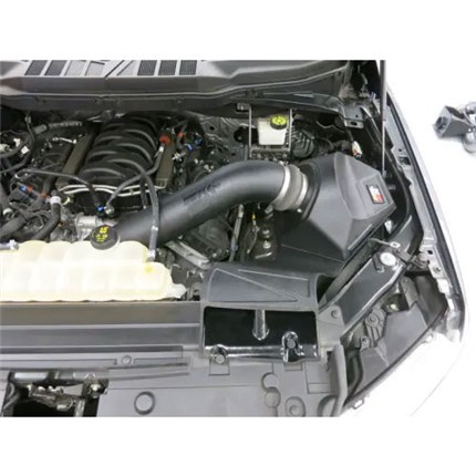 This cold air intake system is engineered specifically for some Ford F150 V8 5.0L models, and includes a larger than stock fresh air scoop behind the front grill to increase airflow to the high-performance enclosed air box filter assembly. A high-density polyethylene (HDPE) rotationally-molded tube helps increase the volume of airflow to your engine, and provides a guaranteed increase in horsepower and torque. The included washable, reusable High-Flow Air Filter features oiled cotton filter media, and the oversized, conical design allows you to go up to 100,000 miles between filter services under normal highway driving conditions. An enclosed air box design helps protect the filter and inlet air from the heat of the engine bay, and allows for quick access to the filter. The entire system can typically be installed in less than 90 minutes. Some intakes are not legal for sale or use on any pollution controlled motor vehicle in California. See the product specifications for CARB status on each part for a specific vehicle.
