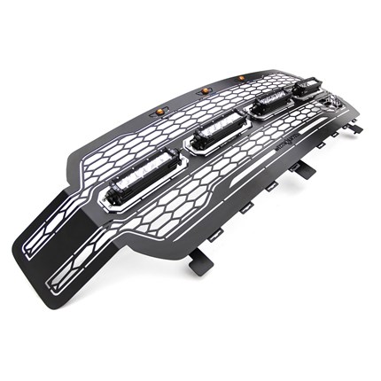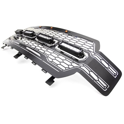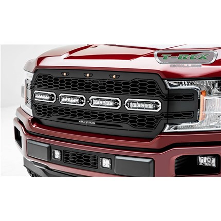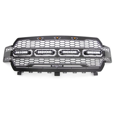 Upgrade your Ford truck with the T-Rex Revolver Grille! This complete replacement grille is crafted from black powder-coated mild steel, featuring precision laser-cut 1-piece construction for durability and sleek style. Its standout design includes a unique honeycomb laser-cut pattern, prominent daytime amber running lights, and customizable removable aluminum accent trim, ideal for color matching. Available with or without ZROADZ LED lights, this grille can include four 6-inch ZROADZ single-row slim light bars, boasting 2921 lumens, 30 watts, and CREE 5W LED chips with a 50,000-hour lifespan. The package comes with everything needed for installation, including a wiring harness, relay, and toggle switch to control the lights from inside your cab. As a complete replacement grille, no cutting or drilling is required, and it accommodates Ford trucks with or without a front camera. Pair it with the matching T-Rex Revolver bumper grille for a complete look. Backed by a lifetime structural warranty and a three-year finish warranty, the Revolver Grille delivers both style and performance.