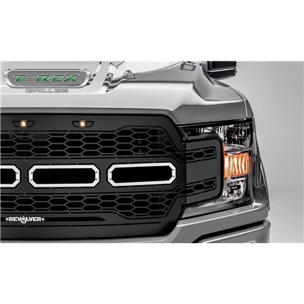 Take your Ford truck to the next level with the T-Rex Revolver Grille! This grille is a complete replacement made from black powder-coated mild steel, featuring a precision laser-cut 1-piece construction. Its standout design includes a unique honeycomb laser-cut pattern, amber daytime running lights, and removable aluminum accent trim for easy customization. Available with or without ZROADZ LED lights, the grille can come equipped with four 6-inch single-row slim LED light bars boasting 2921 lumens, 30 watts, and CREE 5W LED chips, with a 50,000-hour life span. The LED-equipped version includes a wiring harness, relay, and toggle switch for easy installation, allowing you to control the lights from inside your cab. Since it's a complete replacement, no cutting or drilling is required, and all necessary hardware is included. It also has options for trucks with or without a front camera. To complete the look, you can pair the grille with a matching T-Rex Revolver bumper grille. This product is backed by a lifetime structural warranty and a three-year finish warranty.