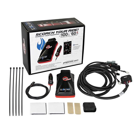 SCORCHER BLUE App: The aFe POWER SCORCHER BLUE app is free on the APP Store and Google Play store and allows the smartphone device to become a handheld remote for the module. It also displays fuel pressure and turbo boost gauges, allows you to customize each power mode, upgrade to the latest revision and even measure 0 to 60 and ¼ mile times.
