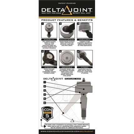 These upper control arms feature ICON's patented Delta Joint. The Delta Joint is a heavy duty high angle ball joint that combines the durability of a ball joint with the performance characteristics of a traditional uniball. While the industry standard uniball does a great job of allowing the control arms of a vehicle to articulate with little bind, they do have an inherent weakness that leaves more to be desired when used in a daily driven application - exposure to the elements. The Delta Joint features a zinc plated housing providing the first layer of corrosion resistance, while a tough grease seal keeps potentially harmful elements out of the inner workings of the joint. Metal on metal construction and a greasable design increase the longevity of the Delta Joint while at the same time allowing for noise-free operation. What makes the Delta Joint unique is that it brings the best of both worlds to ICON upper control arms with features that make it more robust than a uniball, and at the same time capable of greater angularity than a typical ball joint.