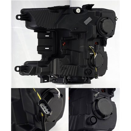 These PRO-Series projector headlights are with a dual projector design with a T-shaped DRL tube in white LED, and the bottom is with sequential turn signal in amber LED. The headlights also come with activation light, which is a light sequence that turn on when you unlock your vehicle. The inner projector is for high beam, while the outer projector is for low beam. These PRO-Series projector headlights are using H7 halogen bulbs for low beam and H7 halogen bulbs for high beam.