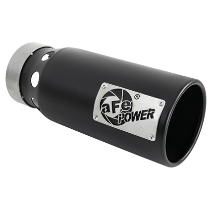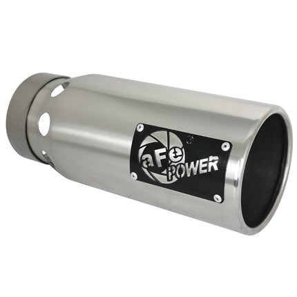 aFe Power is proud to introduce an all new intercooled exhaust tip. This tip comes with a black or polished finish and is designed to fit 4" exhaust systems. With a 4" inlet x 5" outlet and 12" inch length, this single-walled, angle cut rolled tip comes with intercooling vents and a unique laser-cut aFe Power logo plate riveted on for an aggressive style.