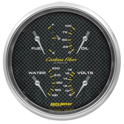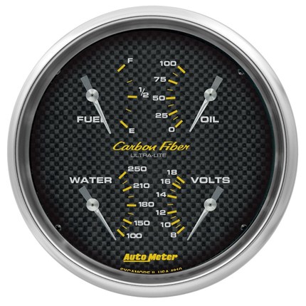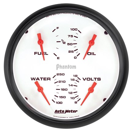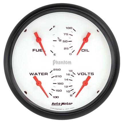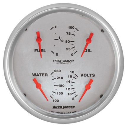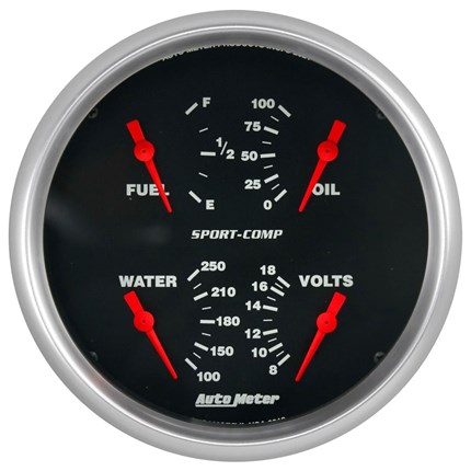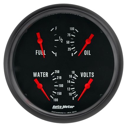 Sometimes space is limited. The AutoMeter Quad Gauge provides a solution to limited dashboard space while providing a clean look. Individual AutoMeter air core meter movements for each function provide the accuracy and durability required by even the most demanding applications. Includes a single wire 1/8” NPT temperature sender and a 1/8” NPT oil pressure sender. The voltmeter reads from 8-18v on negative ground electrical systems and fuel level resistance range is 240 ohms empty to 33 ohms full (compatible with AutoMeter's 3262 fuel level sender).