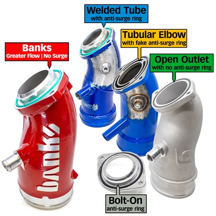 Adding an anti-surge ring after-the-fact only restricts airflow. Our tests of large outlet diameter aftermarket elbows retrofitted with anti-surge rings showed a pressure drop equal to the factory intake elbow. In other words, it completely negated all airflow benefits, matching or underperforming stock.