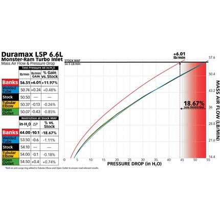 The Monster-Ram's propriety design reduces pressure loss by 18.67% at the compressor inlet which results in an impressive 6.01lb/min gain in Mass Airflow verses stock. Benefits include improved throttle response, lower shaft speed, and increased turbo life.