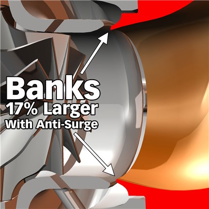 While it may seem simple to oversize this opening and increase airflow, a larger diameter outlet without the correct anti-surge geometry will result in compressor surge.