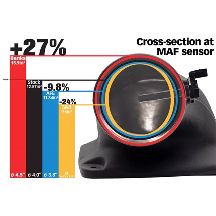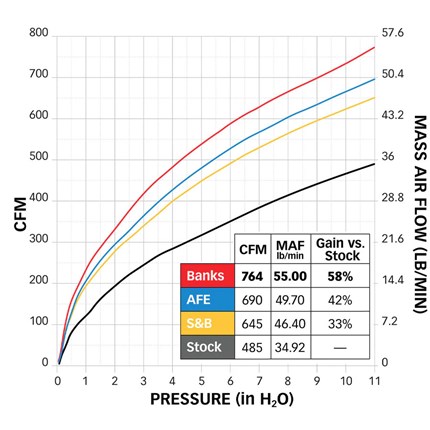 Banks massive filter has an optimized ratio of filter surface area, pleat count, and media thickness allowing it to outflow every other filter tested while breathing evenly from all sides. Banks wins again.