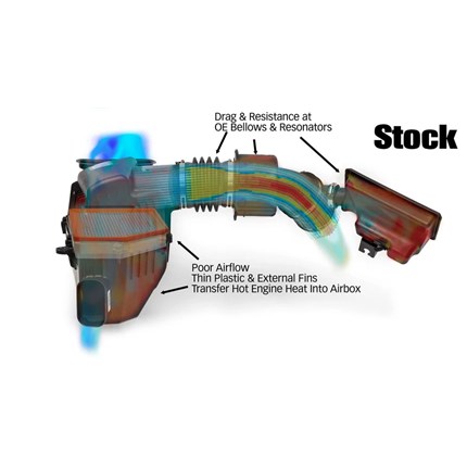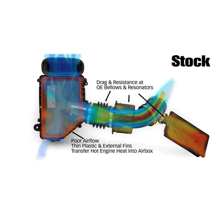 While the factory design does have inlets that mate to the hood's air scoop, its square filter and S-shaped flow path induces turbulence and drag to the intake system lowering Mass Air Flow.