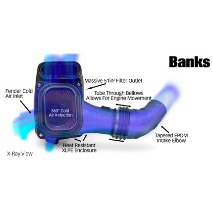 The new Banks Ram-Air system features a durable heat-resistant Cross-Linked Polyethylene enclosure with a smooth organic shape that maximizes cool air volume around the filter and maintains air density into the box itself.