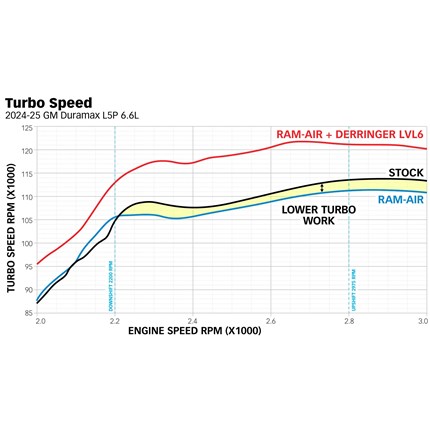 Not only does power come on sooner with the Ram-Air intake, but the turbo spins nearly 3,000 RPM slower increasing its efficiency and longevity. Turbo life is increased because it’s spinning millions of revolutions less over its lifetime.
