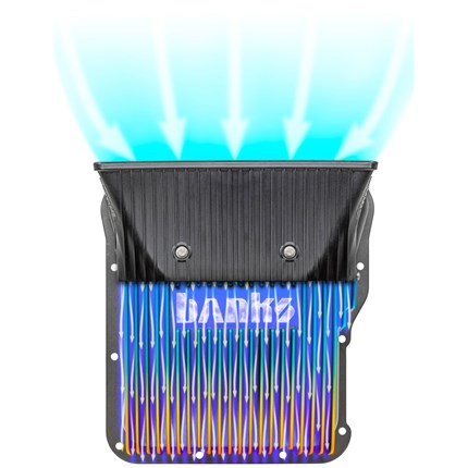Taking advantage of the fast-moving cool air under your truck, the Ram-Air Transmission Pans' Patent Pending design draws ambient air through the large forward-facing scoop, funneling it through the external heat radiation fins.