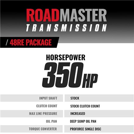 Fully remanufactured transmission featuring the BD Valve Body! The BD Valve Body has many modifications to improve shift quality and extend transmission life. The valve body is equipped with a new heavy-duty governor pressure solenoid as well as an upgraded pressure transducer kit with twice the burst pressure as stock. The RoadMaster transmission also includes a deep sump oil pan for increased fluid capacity and cooling. Every 48RE RoadMaster transmission comes packaged with a BD ProForce Torque Converter.