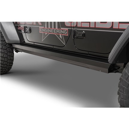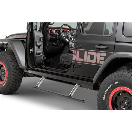 These Generation III Steps Sliders by Rock-Slide Engineering are specifically engineered for the Wrangler JL 4 Door, as a dual functioning full rock slider with a fully functional step that is actuated when the doors open and close. RSE utilizes 11-gauge steel for a super strong design that is both protective and functional and then finishes off the product with a durable black textured powder coat for years of lasting performance. These steps automatically deploy when the doors are opened, and extend a full 12" below the Jeep, and are perfect for lifted vehicles. Then, close the doors and the steps automatically retract to their original position. Should you wish to keep the steps in the retracted position, RSE also includes a rocker switch with wiring to accommodate. Installation is easy, with no drilling or modifications to the Jeep and all necessary mounting hardware is included. Sold in Pairs.