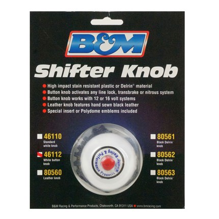 This B&M shift knob has a 12-volt momentary switch which can be used to activate a trans-brake, launch control, nitrous oxide, or two-step ignition control. Fits all B&M shifters with a threaded shift stick and comes with numerous sized adapters to fit various other shift sticks or shifters. SAE thread adapters fit 1/2-20, 3/8-24, 3/8-16, and 5/16-18 threads and work with 12-volt and 16-volt systems.