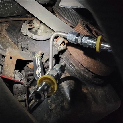 Replace your rusted 94.5-97 E4OD 7.3L Ford Powerstroke transmissions lines with an upgraded CNC Fabrication stainless steel transmission cooler line kit with 1/2" barbs.