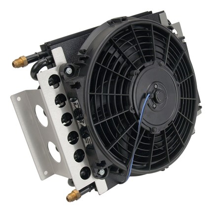 With it's own air supply, the Electra-Cool Remote Transcooler can literally be mounted wherever space permits, making it a popular addition for performance compacts, hot rods, muscle cars and trucks. An efficient 16 pass tube and fin cooler coupled with a Tornado fan and aluminum brackets, this kit comes with a complete installation kit to install easily on all vehicles with 5/16" or 3/8" transmission cooler lines. Also included is an 180°F in-line thermostat for activating the electric fan. This is a durable, trouble-free way to add years to the life of your transmission, and perfect for medium to heavy-duty towing and hauling.