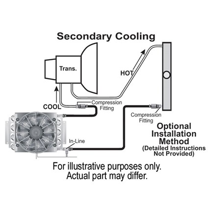• Transmission cooler kit includes fan mounted cooler, two -6AN to 3/8" barbed hose fittings, 180°F In-line thermostat, 10 ft. of OEM spec hose, 5/16" and 3/8" compression fittings, and hardware.