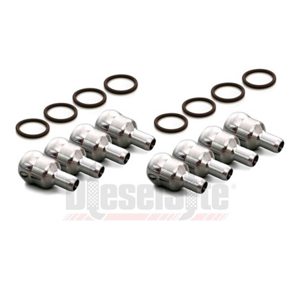A solution for leaking oil rails without the need to replace expensive oil rails. Now, you can rebuild them! The oil rail "nipple" is the connection from the oil rail to the injector itself. It is designed to swivel so it can center itself into the injector as you drop the rail into place. The problem comes when you remove the rail after it has been installed for some time. As the nipple re-centers itself, you will not necessarily seat the o-ring exactly as it was before and the o-ring now leaks. The 2nd issue is the nipple itself wears out from the injector seal and the high pressure oil. We offer the tool to remove the nut holding the nipple in place. Remove the nut, remove the old nipple and o-ring. Clean socket, re-install o-ring, nipple and nut. Tighten to 75 ft/lbs. You need 4 nipples per oil rail. So, for all 2003-2007 6.0L engines, you will need 8 nipples to repair both oil rails. This is a set of all 8.