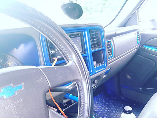 Accessories To cap the truck off Dylan added custom clear headlights with blue pearl accents, paint matched blue shocks, and a paint matched blue exhaust tip.