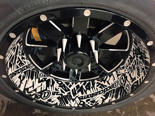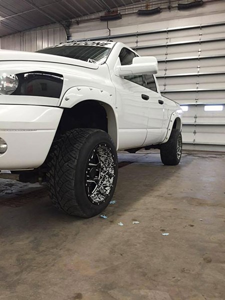 Wheels and Tires Several different combinations of wheels and tires have been on this rig. Currently it's sporting a set of Moto Metals 962 with a custom vinyl wrap from ECD customs. For shoes, Jake chose Atturo Trail Blades 33 x 12.50 R20. If you look close enough you’ll see that he also added color matched spike lug nuts.