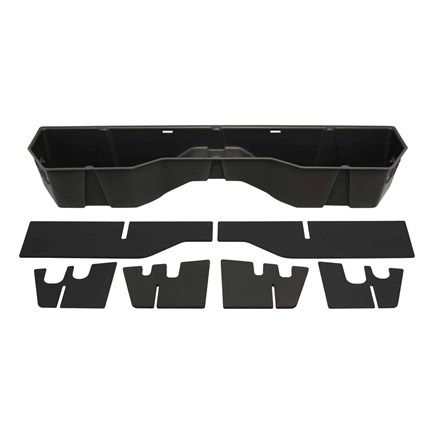 Whether you're a contractor, sportsman, or simply someone looking for a great way to organize your pickup truck and keep your gear safe and out of sight, the DU-HA is perfect for you. The DU-HA allows you to store your gear, guns, power tools, tow ropes, tie-down straps, first aid kit, tackle, bungee straps, hats, boots, gloves, chains, jumper cables, and so much more safely and securely under or behind the back seat of your truck. The DU-HA includes a 2 piece gun rack/organizer, so you can safely store your guns in their upright position. The organizers/gun racks are easily removable so you can store larger items if you’d like. This DU-HA holds 2 rifles or shotguns without scopes. Most DU-HA’s can be installed quickly and easily in under 10 minutes. The DU-HA will blend in seamlessly with your truck's interior and have a factory feel. The DU-HA is constructed from heavy-duty polyethylene, is Made in the USA, and has a lifetime warranty.