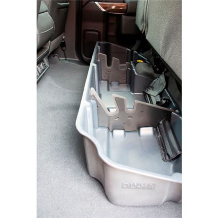 Every DU-HA is custom-designed to fit a particular model of truck. 19-26 Chevrolet/GMC Silverado/Sierra Light Duty Double Cab & 20-26 Heavy Duty Double Cab model is designed to fit underneath your pre-existing back seats. It's constructed from heavy-duty polyethylene and comes with a lifetime warranty. If your truck came equipped with a metal tray or a lid system under the back seat, you will need to remove the factory trays prior to installing your DU-HA. These trays are interchangeable, so you will be able to re-install them later if needed. This DU-HA holds 2 rifles or shotguns, with one scope, but may not act as a legal gun case in states with gun case laws, unless guns are first placed in sleeves.