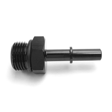 Fleece Quick Connect Fittings. Male AN straight thread O-Ring Boss (ORB) fitting with O-ring to quick connect. Short hex height to maximize install clearance. Black anodized aluminum construction.