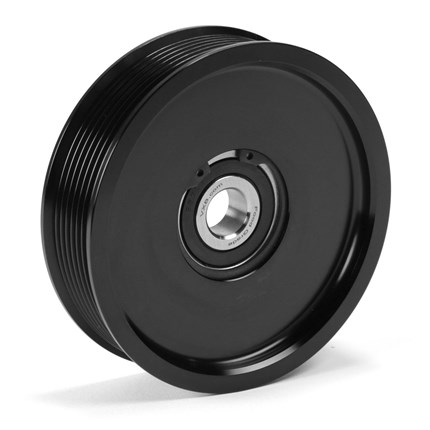 Billet aluminum upper fan idler pulley in our custom spoke design and black anodized finish. Complete with bearing. Fleece's pulley must be used with a factory bolt and spacer. Some aftermarket pulleys will switch to a different length bolt and spacer which will not work with the our billet pulley. For reference, the factory spacer measures 1.8" total height and the factory mounting bolt measures 2.75" in length.