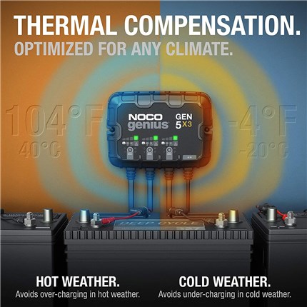 The new integrated thermal sensor automatically monitors and adjusts the charging cycle based on fluctuations of ambient temperature, limiting the chance of under-charging or over-charging, providing a more accurate and fully charged battery. Avoids under-charging in cold weather down to -4F and avoids over-charging in hot weather up to 104F.